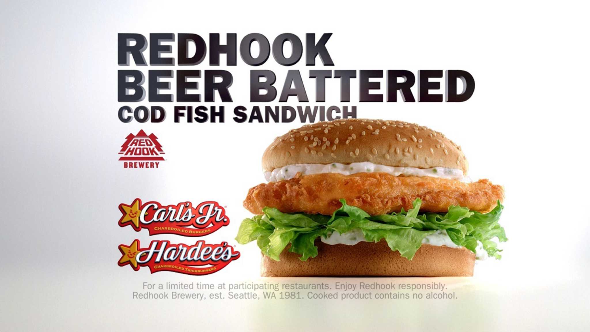 Review: Carl's Jr. - Red Hook Beer Battered Cod Fish Sandwich Carl's Jr.'s Red Hook Beer Battered Cod Fish Sandwich features a cod filet fried with batter made with Redhook Extra Special Bitter (ESB) ale, lettuce, tomato, tartar sauce, and a sesame bun. It goes for $3.99 in my area but I received this courtesy of Carl's Jr. I actually had to get this twice because the first time around they gave me a breaded chicken filet and it looked like this: