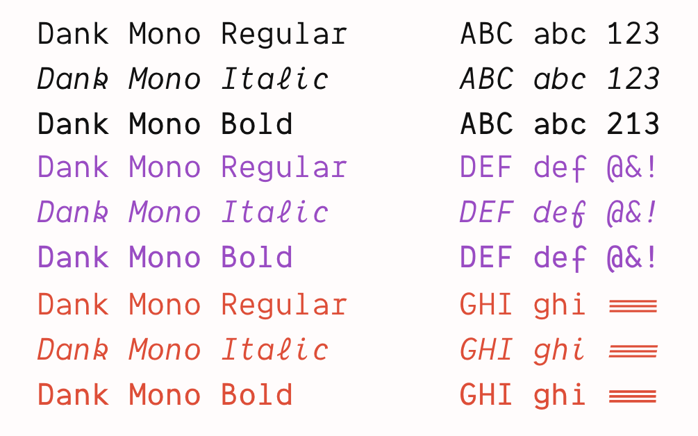 Dank Mono: The coding typeface for aesthetes - Gumroad A typeface designed for coding aesthetes with modern displays in mind. Delightful ligatures and an italic variant and bold style.The included character set includes latin uppercase and lowercase letters, all modifiers, and diacritics covering most European languages. Additionally it covers an exhaustive list of math symbols, the basic Greek glyphs, some terminal glyphs (e.g. unicode block ...